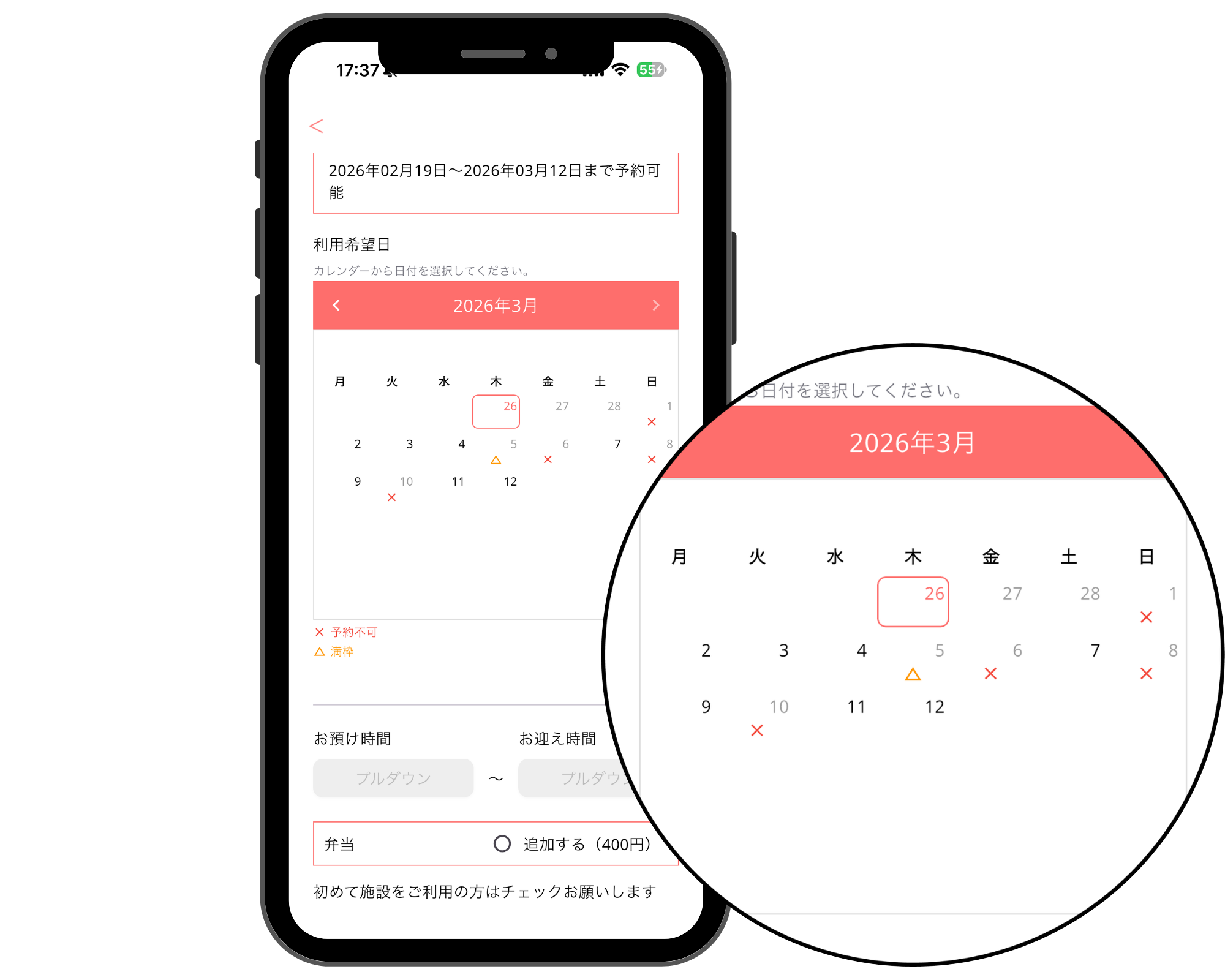 テトテル操作マニュアル 予約受付カレンダー設定 保護者がアプリから「いつからいつまでの日程を予約できるか」という受付期間をコントロールする機能です。 対象プラン: ミニマム ベーシック STEP 01 予約可能期間の指定 「何月何日から何月何日まで予約を受け付けるか」という期間を設定します。例えば「1ヶ月先まで予約可能」といった制限を設けることができます。 STEP 02 保護者アプリへの自動反映 設定した期間は自動的に保護者アプリのカレンダーに反映されます。予約受付期間外の日は選択できないようになるため、保護者の操作ミスを防げます。 📱 保護者アプリのカレンダー表示 非表示 受付期間外 設定期間外の日付は、選択不可または非表示になります。 表示 予約受付中 設定された期間内のみ、予約手続きへ進めます。 ×