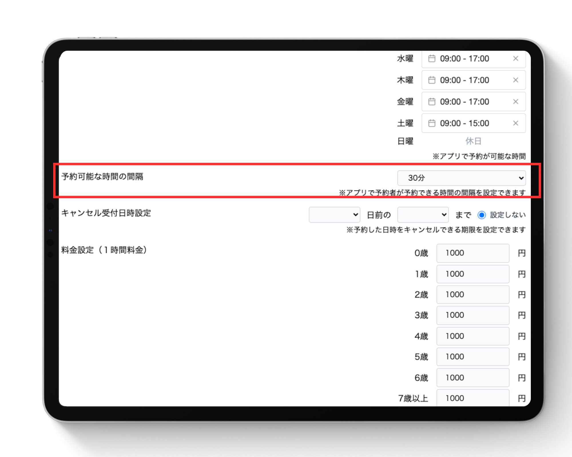 保護者が予約を入れる際の「開始・終了時間の刻み幅」を決定する機能です。