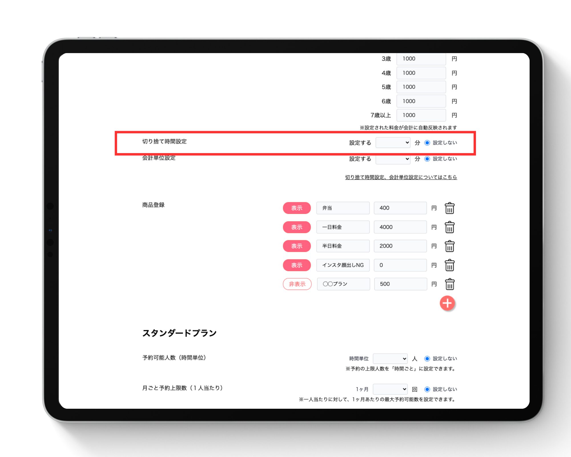 この設定により、お迎え時の実利用時間から、設定した単位未満の時間を切り捨てて料金計算を行うことができます。