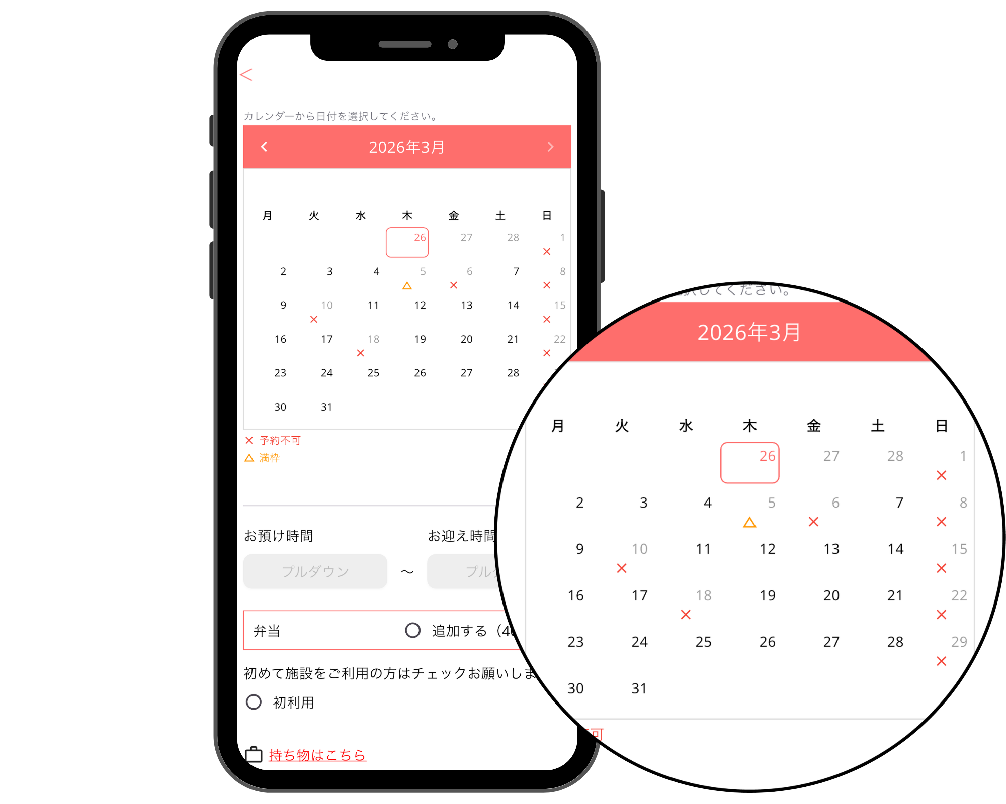 設定完了後、保護者アプリのカレンダーで「△(満枠)」となっている日を選択すると、キャンセル待ちの案内が表示されます。保護者はここからキャンセル待ちの申請が可能になります。
