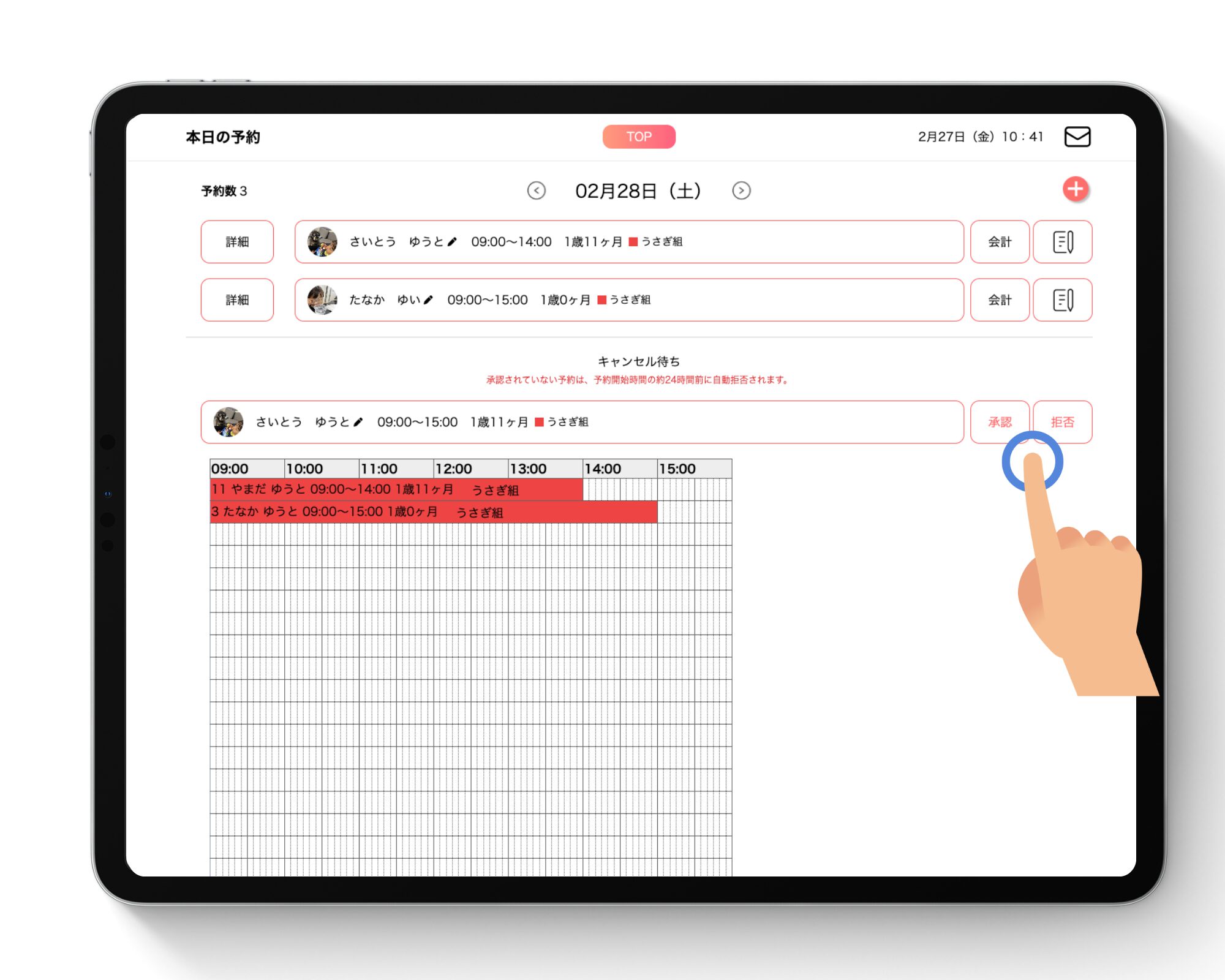 既存の予約にキャンセルが出て空きが生じた場合、施設側でキャンセル待ちの「承認」または「拒否」の作業を行います。この操作により、誰を受け入れるかを施設側で最終判断できます。