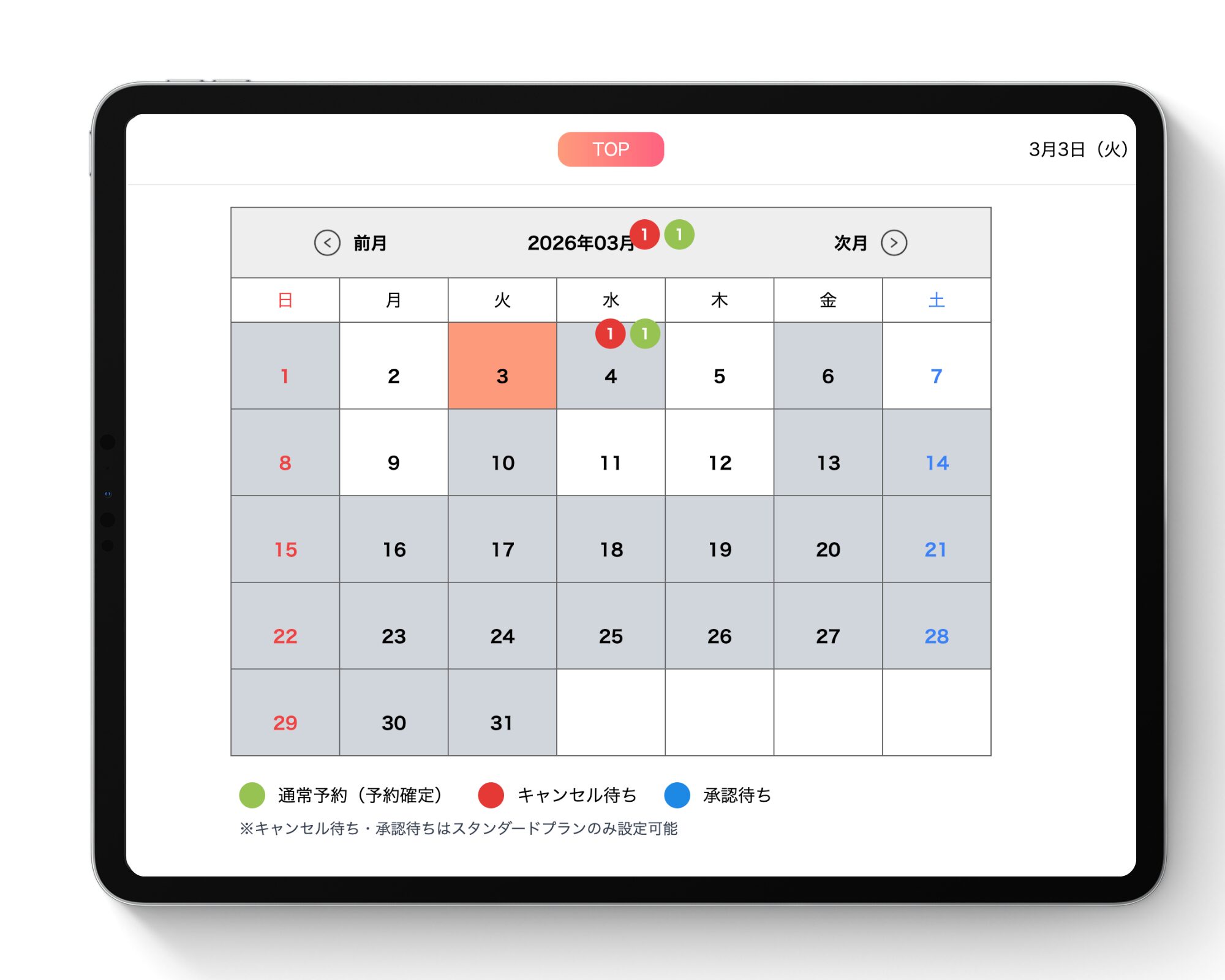 キャンセル待ちが発生しているかどうかは、「月の予約カレンダー」画面で確認することができます。どの日程に待ちがあるかひと目で把握できます。
