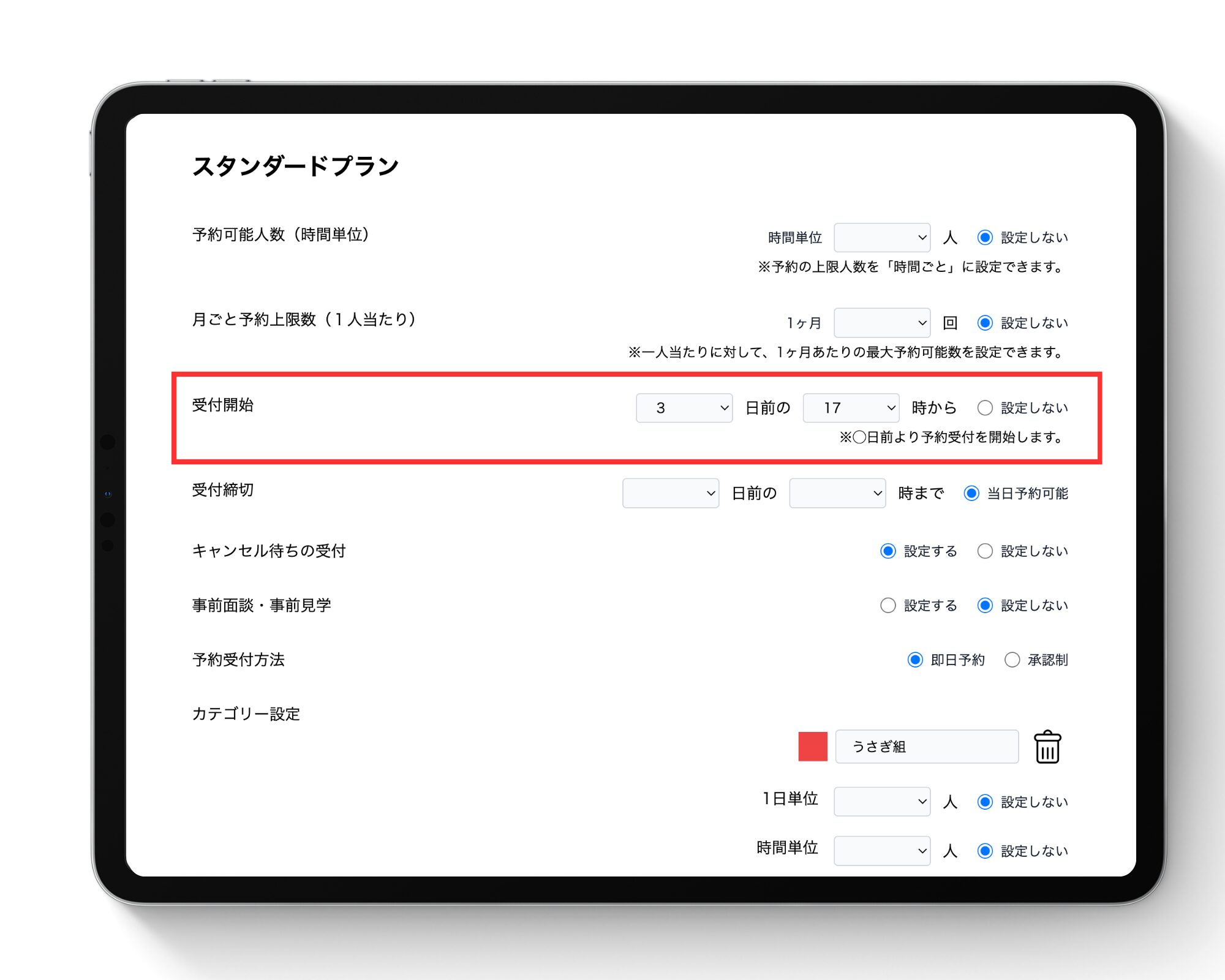 予約の受付を「利用日の◯日前の◯時」から一斉にスタートさせるよう制限できる機能です。