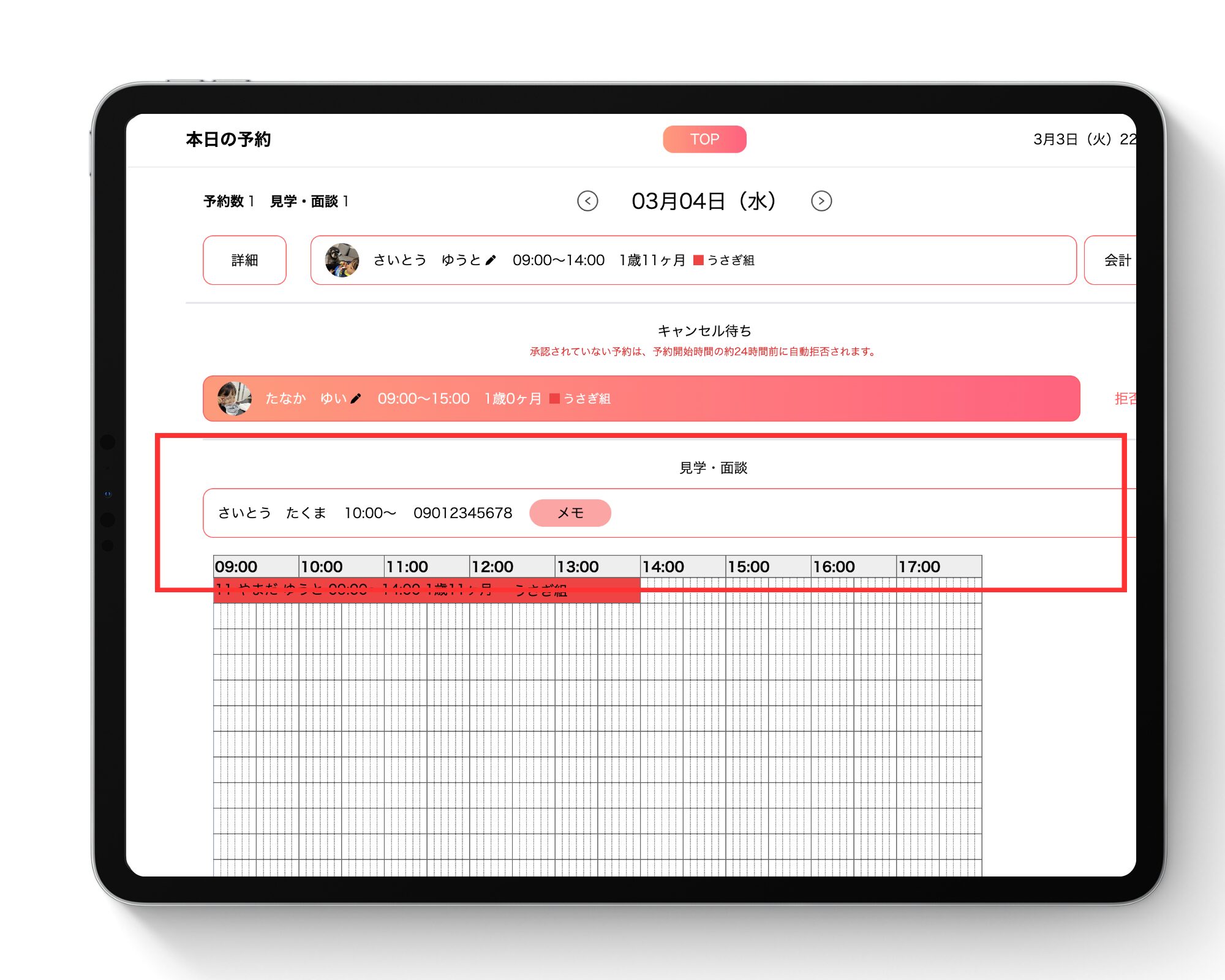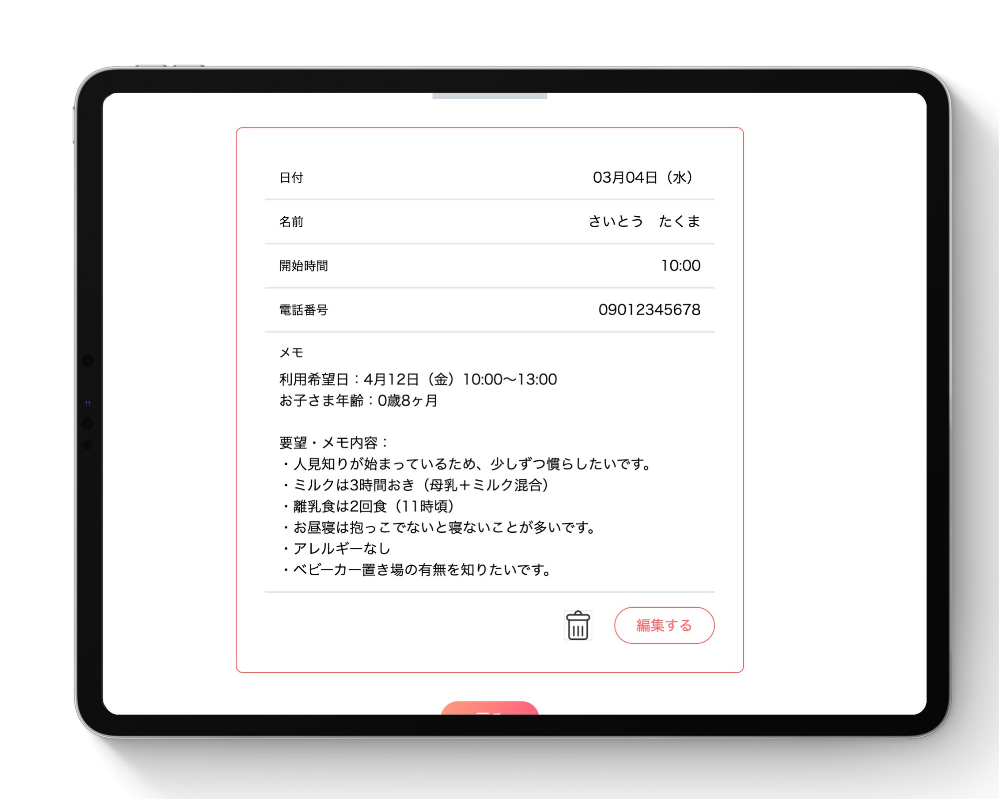 電話で予約を受けた際、単に日時を入れるだけでなく、メモ欄に「アレルギーの有無」「以前の預け先での様子」「特に気にされている点」などを入力可能です。面談当日に担当者が変わっても、メモを見るだけで「お電話でお伺いした件ですが…」とスムーズに話を切り出せるため、保護者様からの信頼度がぐっと高まります。