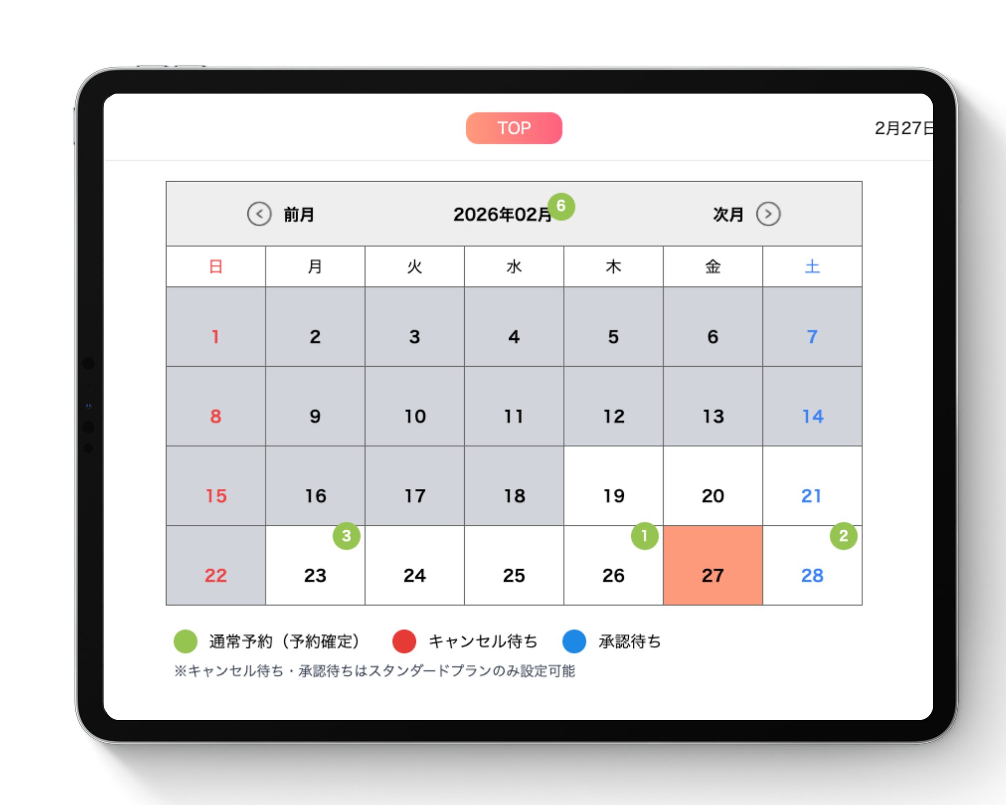 予約カレンダー画面では、1ヶ月単位で予約数や空き状況をまとめて確認できます。